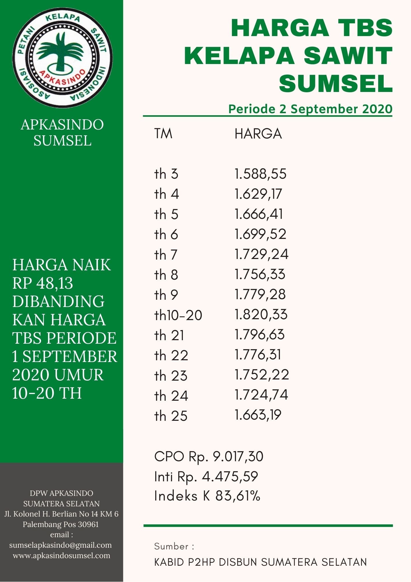 Harga tandan buah segar kelapa sawit provinsi sumsel periode 2  september 2020 berdasarkan penetapan tim penetapan harga Dinas Perkebunan Provinsi Sumatera Selatan sebagai berikut :